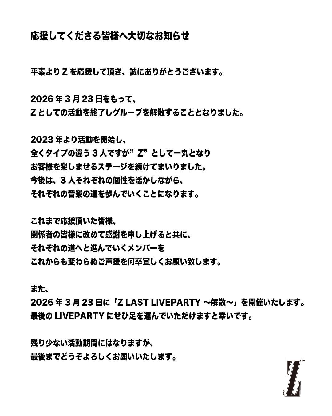 をもって、Zとしての活動を終了しグループを解散することとなりました。